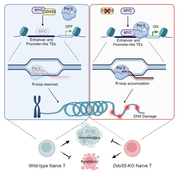 研究团队通过构建T细胞特异性敲除小鼠模型,证实了DDX55在维持初始T细胞稳态中的关键作用。实验结果显示,缺失DDX55会导致小鼠外周T细胞数量显著减少、细胞凋亡增加,且初始T细胞失去增殖能力。进一步机制研究表明,DDX55通过抑制转座子(TEs,也称为“跳跃基因”)的异常活化,维持基因组的稳定性。这些转座子一旦异常激活,会产生大量R-loop结构,引起DNA损伤。而DDX55的缺失正是导致这一连锁反应的关键。有趣的是,研究还发现DDX55通过抑制转录因子MYC与TEs的结合,间接抑制TEs的转录活性,从而维持T细胞的静息状态。