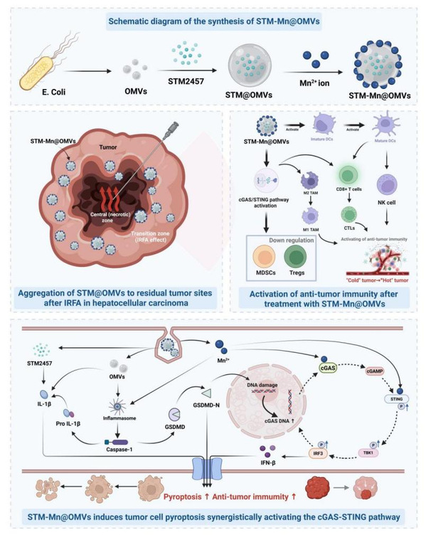 来源于革兰氏阴性菌的外膜囊泡(outer membrane vesicles, OMVs)作为一种新兴的生物载体,兼具药物递送与免疫调节优势,可通过与肿瘤细胞膜直接融合实现高效、精准的胞内递送并减少非特异性蓄积。本研究以大肠杆菌来源 OMVs为基础,引入m6A甲基化抑制剂STM2457和 Mn²⁺,构建新型工程化递药体系 STM-Mn@OMVs。该体系可诱导肿瘤细胞焦亡(pyroptosis),协同激活 STING通路,促进树突状细胞成熟和T细胞活化,增强抗肿瘤免疫应答,并显著降低 Tregs、MDSCs浸润,促使肿瘤相关巨噬细胞由免疫抑制向免疫激活表型转变,从而部分逆转免疫抑制性肿瘤微环境。