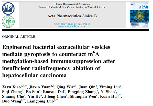 近日,暨南大学罗良平/肖泽宇教授团队在国际知名期刊Acta Pharmaceutica Sinica B(IF=14.6)发表题为“Engineered bacterial extracellular vesicles mediate pyroptosis to counteract m6A methylation-based immunosuppression after insufficient radiofrequency ablation of hepatocellular carcinoma”的原创论文。