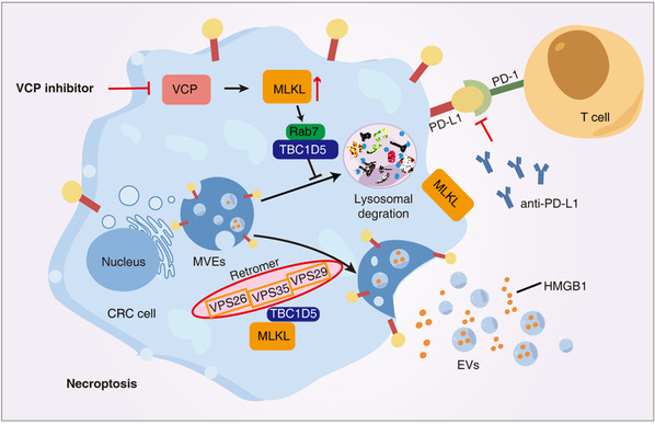 通过基于数据非依赖采集模式的定量蛋白质组学分析,研究团队鉴定出MLKL是VCP的关键底物,VCP抑制可延缓MLKL的蛋白酶体降解。累积的MLKL进一步募集GTP酶激活蛋白TBC1D5,使Rab7A失活,从而将携带PD-L1的囊泡重定向至由逆向转运复合体介导的回收通路,最终递送至细胞膜。这一机制在分子层面解释了VCP抑制剂诱导程序性坏死过程中出现的矛盾性免疫抑制现象。
