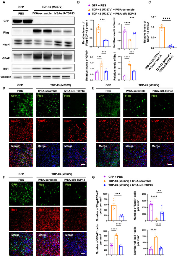 为了评估体内自组装siRNAs在减轻TDP-43相关病理方面的治疗效果,研究团队通过立体定向注射突变TDP-43 (M337V)病毒进入纹状体构建了TDP-43疾病小鼠模型。然后每周两次给药体内自组装siRNAs,共计四周。结果发现靶向TDP-43的体内自组装siRNAs给药治疗后,TDP-43模型小鼠的运动功能障碍得到有效改善,外源性TDP-43表达水平降低,神经元丢失和胶质细胞增生有所减少。因此,这些结果显示出了靶向TDP-43的体内自组装siRNAs具有治疗TDP-43相关神经退行性疾病的治疗潜力。