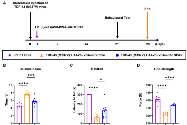 图4 单次静脉注射基于AAV8的体内自组装siRNAs有效改善TDP-43模型小鼠的运动功能障碍