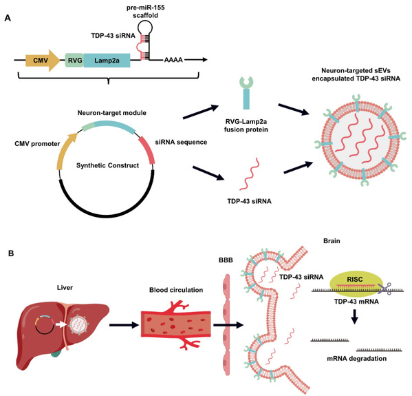 研究团队创新性地基于合成生物学原理设计了一个靶向TDP-43的体内自组装siRNAs的合成构建体(质粒DNA形式),包含了三个核心功能模块:CMV高效启动子、TDP-43 siRNAs表达骨架以及靶向神经元的RVG-Lamp2a融合蛋白标签。靶向TDP-43的体内自组装siRNAs通过静脉注射进入机体后会被肝脏摄取吸收,其后肝脏细胞会表达体内自组装siRNAs各个功能模块,表达合成pre-miRNA经过内源性miRNA加工机制形成成熟的TDP-43 siRNAs,并且这些TDP-43 siRNAs会自发组装到RVG肽修饰的sEVs中。这些sEVs能够携带TDP-43 siRNAs会进入血液循环,最终RVG靶向标签的作用下通过血脑屏障高效地递送到神经中枢系统,靶向TDP-43 mRNA从而降低TDP-43的表达水平。